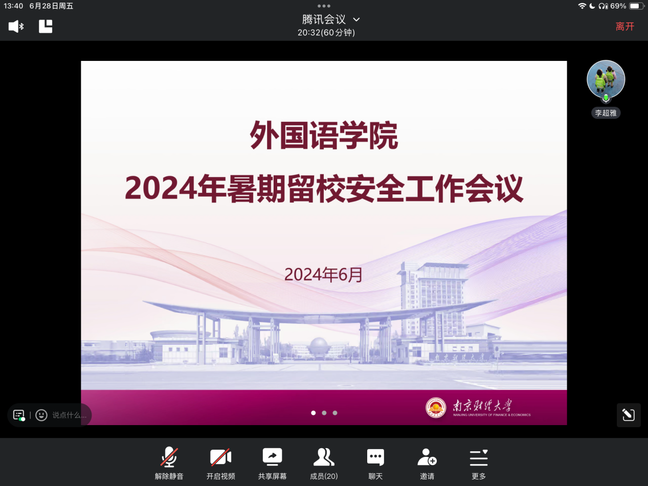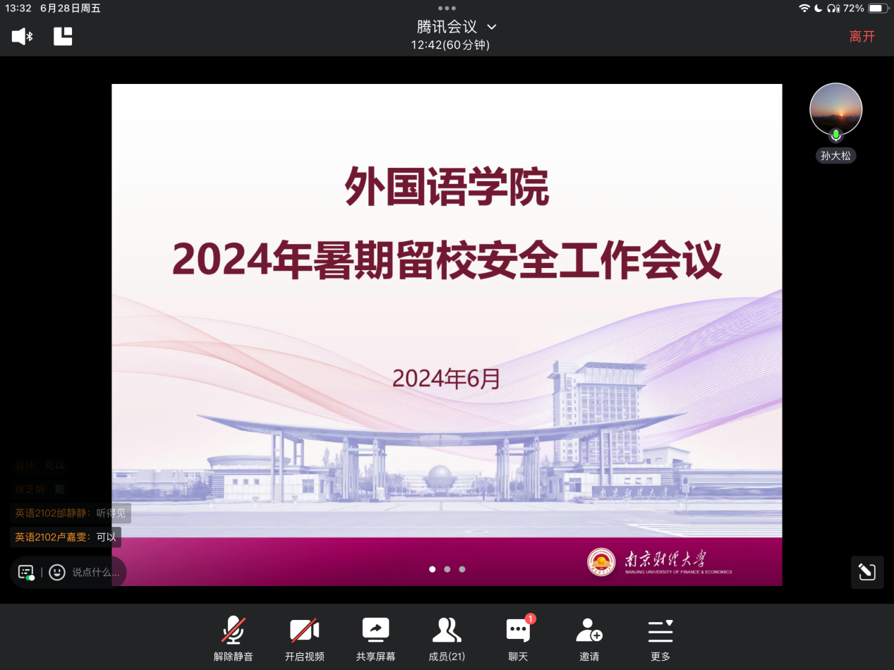 加强学生暑期安全教育,筑牢安全防线,引导学生做好暑期学习生活规划,久赢策略论坛6月28日召开2024年暑假留校安全工作线上会议。久赢策略论坛党委副书记孙大松、学工办主任李超雅、学院全体辅导员、暑期留校的本科生及研究生参加会议。本次会议由党委副书记孙大松主持。