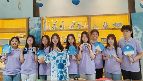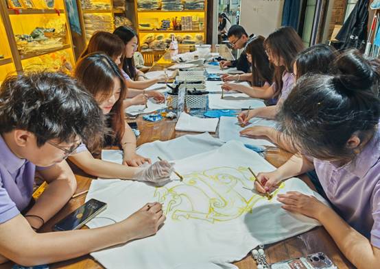 活动伊始,手工艺人向同学们介绍扎染的历史、艺术特征和应用范围、染液的成分、扎染的基本技法,“扎染工艺分为扎结和染色两部分,通过线、绳、皮筋等工具,对织物进行扎、缝、缚、缀、夹等多种形式组合后进行染色。”扎染手工艺人一边向学生讲解,一边分发笔、织物、染料等物品。为了给学生带来原汁原味的传统文化和手作体验,此次劳动教育实践活动在久赢策略论坛优秀校友石贤的“从黔故事”民族文化生活馆中开展。白色的短袖、方巾、扇子和发圈是此次扎染和刺绣的材料,在学习了扎染的基本知识和具体步骤之后,各组同学自行构想出各自扎染主题并进行创作。在手工艺人的耐心指导下,同学们全身心投入到扎染制作中,大胆设计,细心琢磨,认真落笔,有的按照图样精准操作,有的则放手一搏,展现个性风采,巧妙地折叠、捆扎,在染缸中完成染色后,解开捆扎,呈现出层次分明、色彩斑斓的扎染艺术品。漆扇制作也吸引了众多学生的参与。同学们亲自体验调漆、滴漆、拨纹等步骤,在扇面上描绘春天,创作出绚丽多彩的漆扇作品。在动手实践中体验传统文化,更让他们坚定了文化自信,做中华优秀传统文化的忠实传承者。