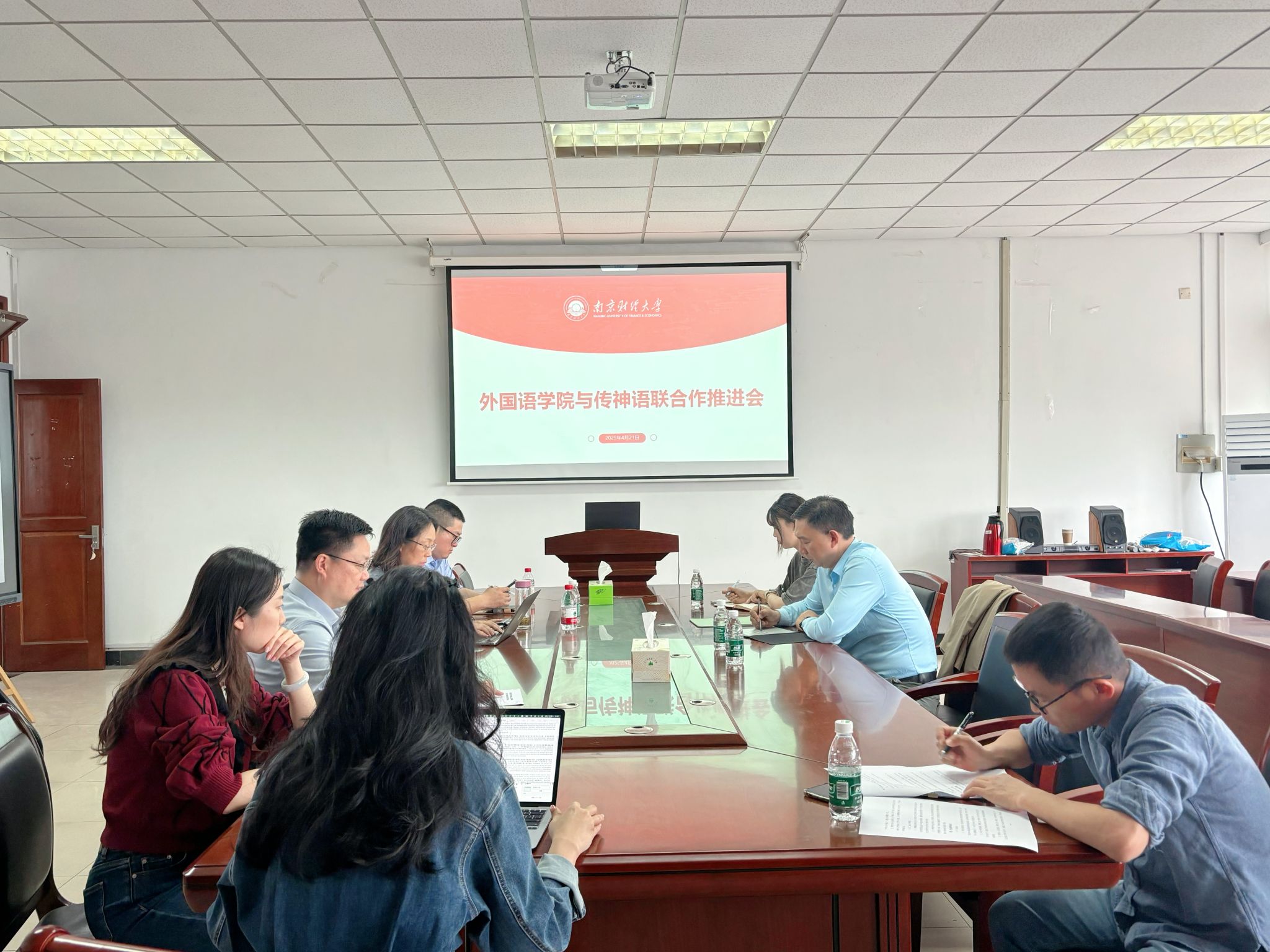 为深化产教融合,推进应用型人才培养,4月21日下午,久赢策略论坛与传神语联网络股份有限公司在仙林校区德正楼308会议室举行产业学院及特色实验班建设推进会。传神语联网网络科技股份有限公司副总裁、湖南传神科技有限公司董事长兼总经理左仁君,北京九州新语科技有限公司、南京译桥翻译有限公司总经理左佳佳,久赢策略论坛党委书记李骏、副院长(主持工作)丁强、党委副书记孙大松,教务处教学研究科科长刘帅及相关教师出席出席会议。